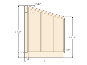 | + | [* black] Cut the top of the OSB sheet by marking the vertical distances up each side and measuring out 3.5" at a right angle (using a square) from the higher point (5' 3-3/4"). From this point snap a chalk line to the lower vertical point (4' 2-1/8"). Use a 7-1/4"circular saw to make the cut. |