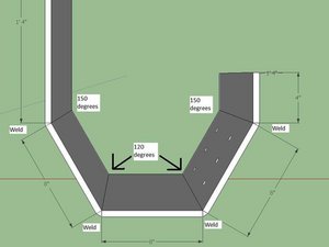 | + | [* black] From the square plate to the adjacent plate (the plate without holes) the angle is 150 degrees. From the 4” plate to its adjacent plate (the plate with holes) is also 150 degrees. From the remaining 8”x16” plate to the two adjacent plates the two angles are 120 degrees. |
