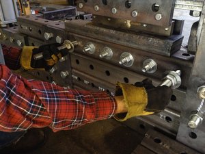 | [* black] Put the table assembly threaded rods through the frame from the side with the lower blade. They should go through the holes on either side of the lower blade plate. | |